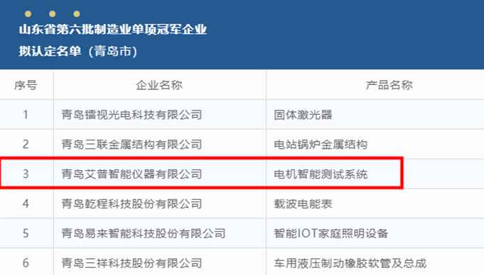 日前,山東省工信廳、省工業(yè)經(jīng)濟聯(lián)合公示了第六批山東省制造業(yè)單項冠軍擬認定名單,艾普智能榮獲“電機智能測試系統(tǒng)單項冠軍企業(yè)”稱號。“單項冠軍”,是企業(yè)市場競爭力的體現(xiàn),分為示范企業(yè)和產(chǎn)品兩類。從評選條件看,企業(yè)必須滿足市場份額、創(chuàng)新能力、質(zhì)量效益等5項基本條…